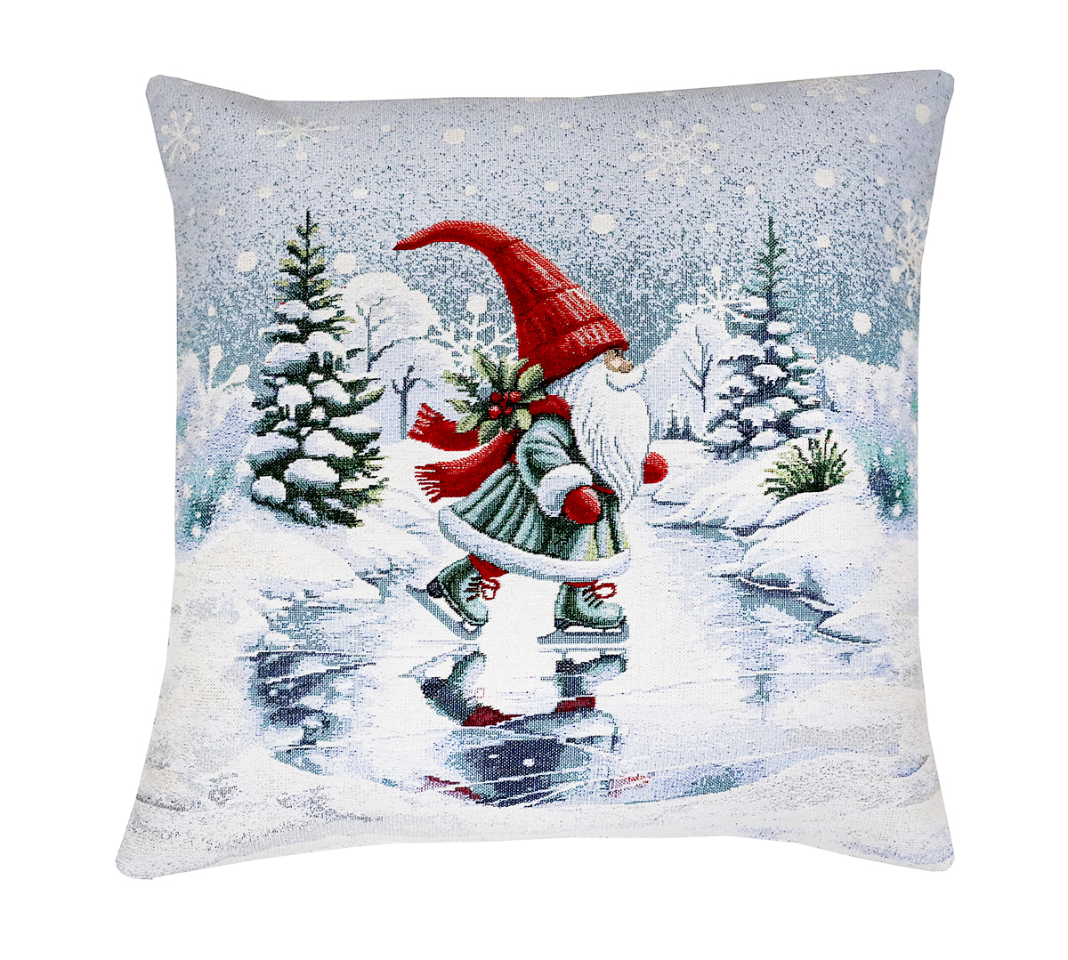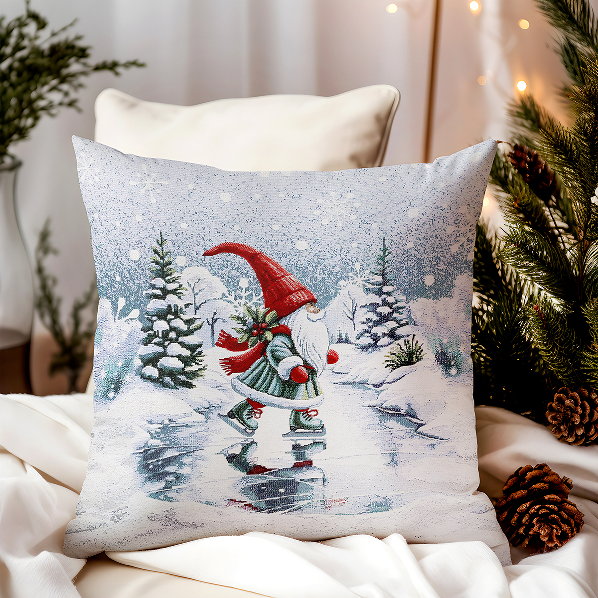 Vytvorte si doma čarovnú zimnú atmosféru s touto krásnou gobelínovou obliečkou na vankúš. Krásny motív vianočného škriatka s dlhou červenou čiapkou, ktorý sa korčuľuje na zamrznutom jazere uprostred zasneženej krajiny. Kombinácia jemných zimných odtieňov s červenými detailmi pôsobí elegantne a hravo zároveň.