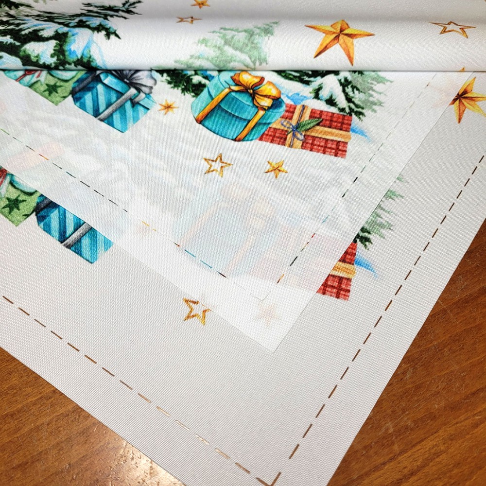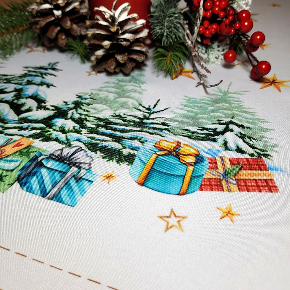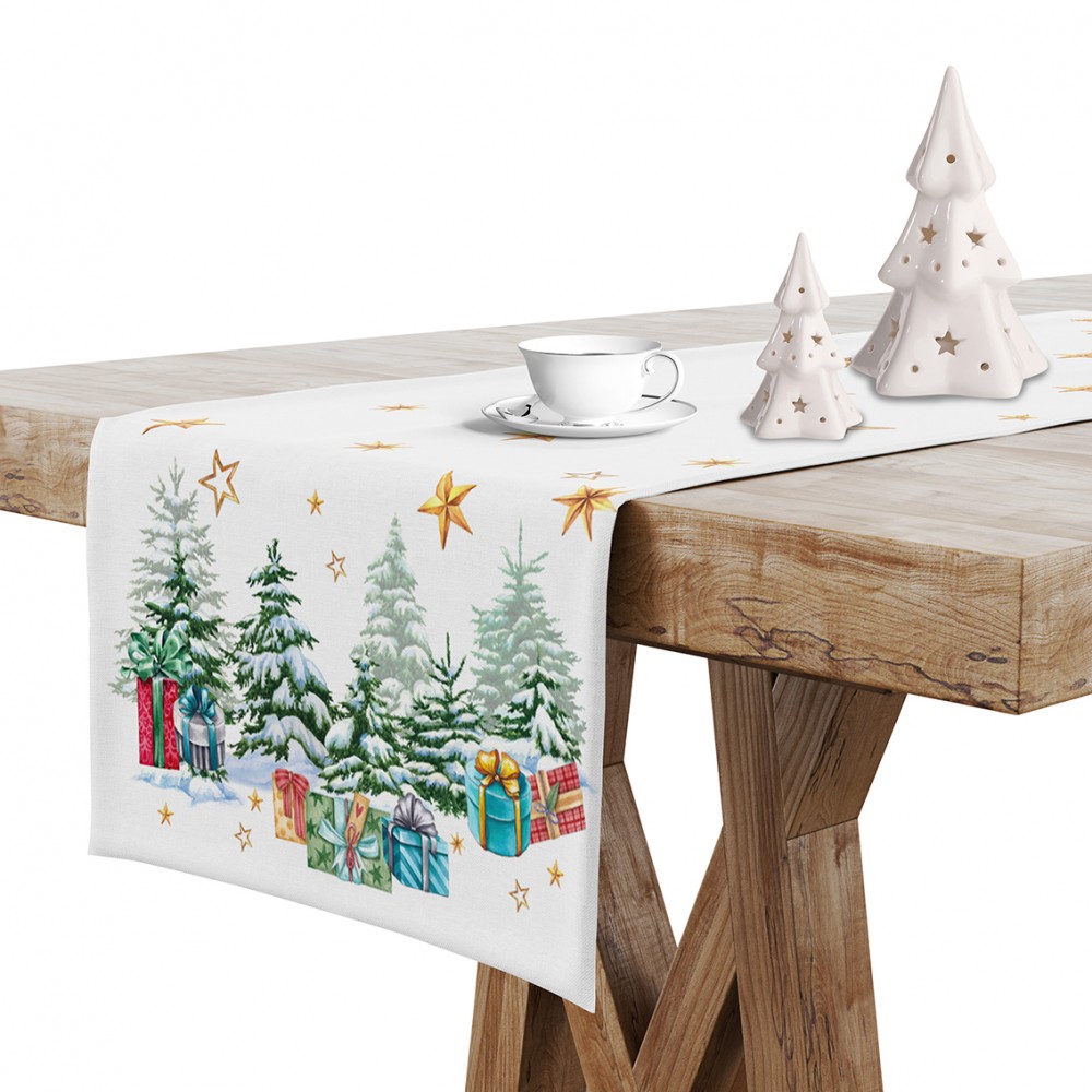 Behúň na stôl vianočný stromček doplnený o farebné darčeky je dokonalým riešením na vianočný stôl.