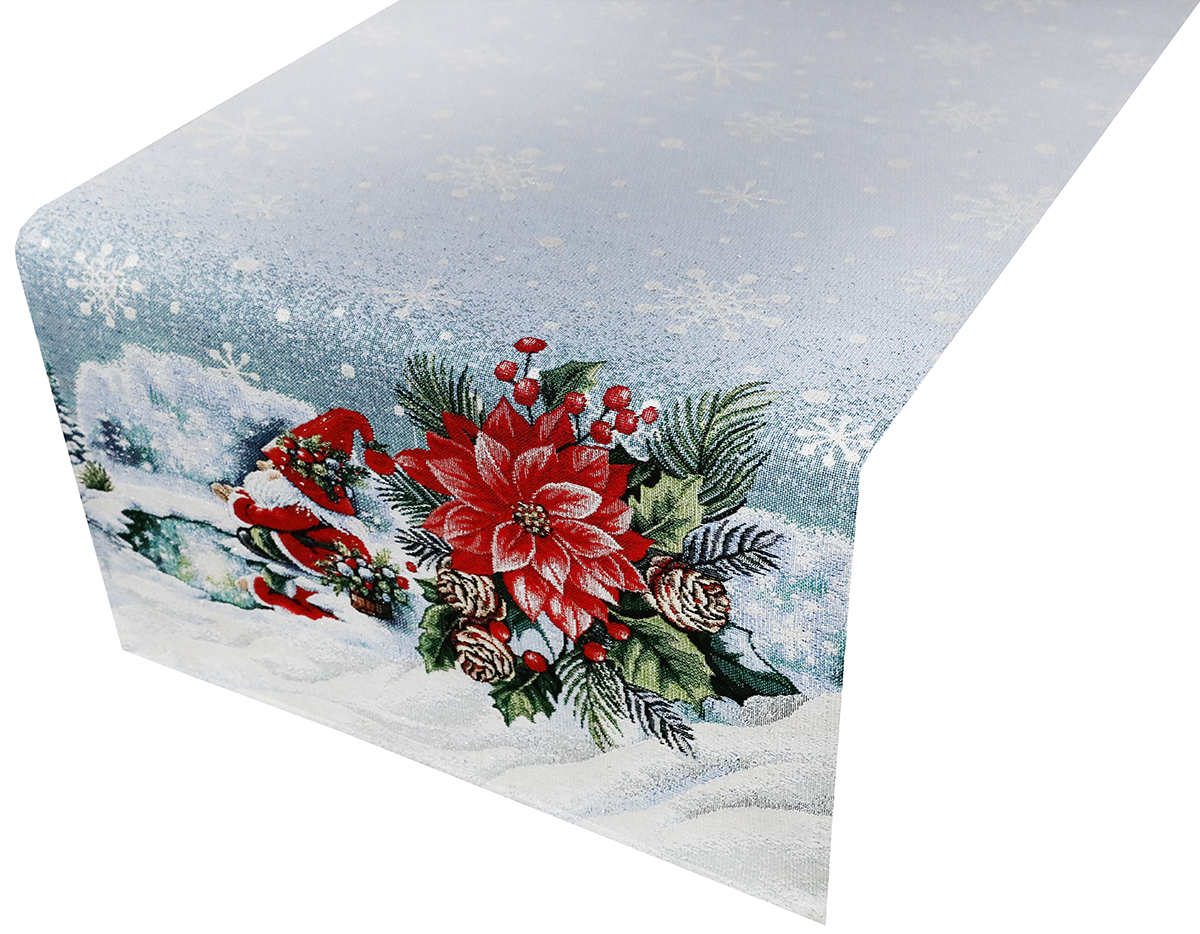 Vytvorte si doma čarovnú zimnú atmosféru s týmto krásnym vianočným gobelínovým behúňom na stôl. Krásny motív vianočného škriatka s dlhou červenou čiapkou zdobený lurexom, ktorý sa korčuľuje na zamrznutom jazere uprostred zasneženej krajiny. Kombinácia jemných zimných odtieňov s červenými detailmi pôsobí elegantne a hravo zároveň.