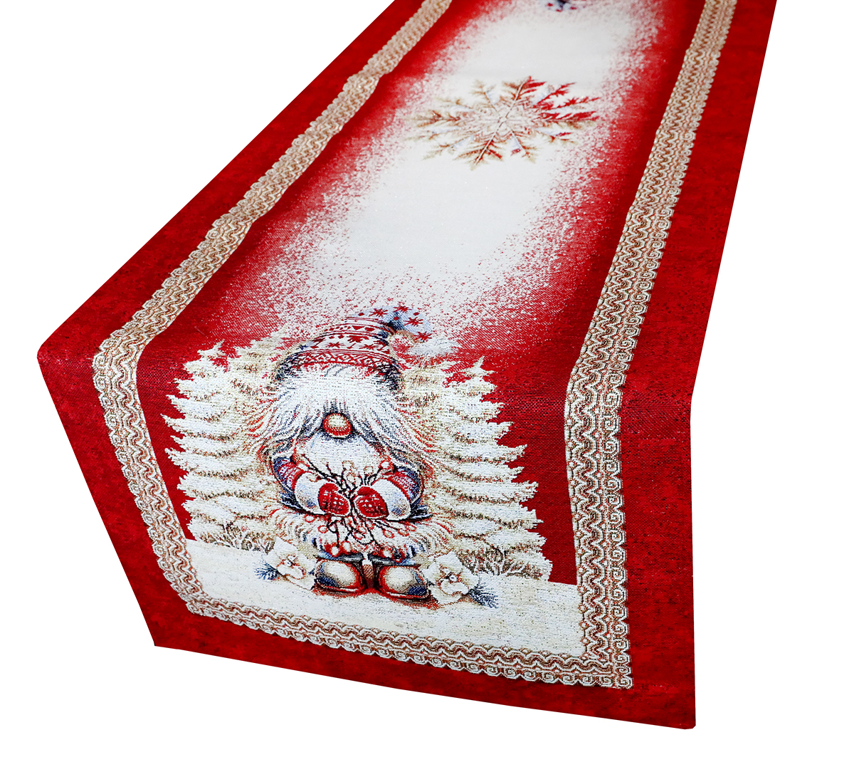 Tento elegantný vianočný gobelínový behúň na stôl je ozdobený zlatou lurexovou nitou, ktorá pridáva nádych luxusu. S motívom vianočného škriatka a zasnežených stromčekov v červeno-zlatej farebnej schéme je perfektným doplnkom pre vytvorenie sviatočnej atmosféry. Vhodná pre milovníkov tradičného vianočného dizajnu s moderným nádychom.