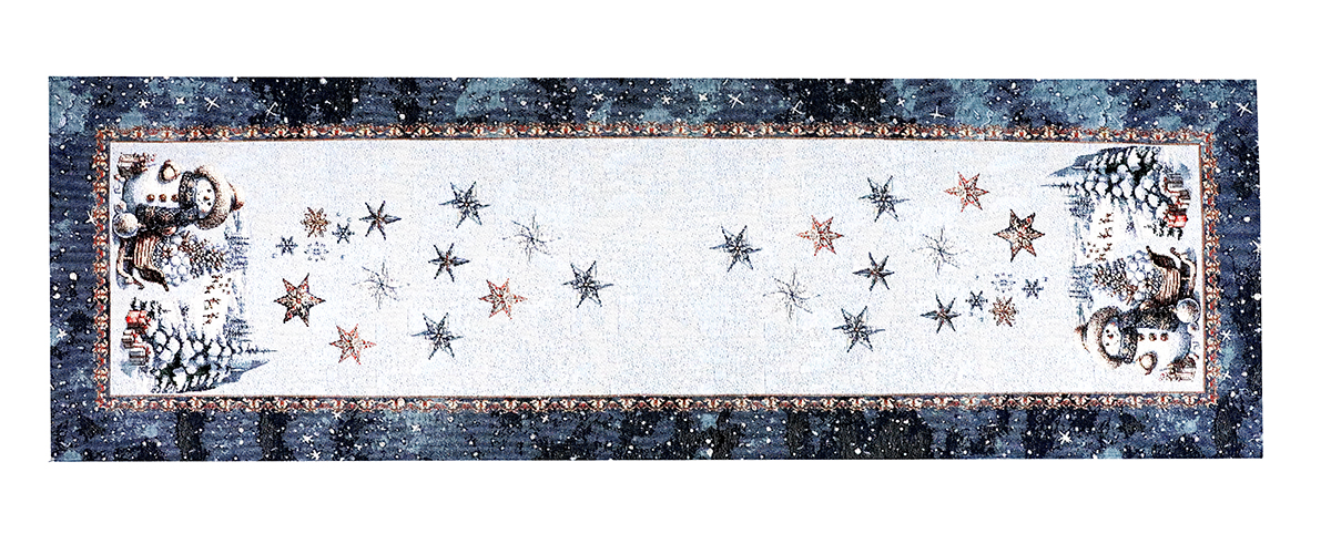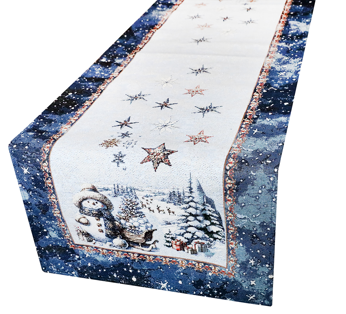 Luxusný vianočný gobelínový behúň na stôl zdobený lurexom s pôsobivým motívom Santu v zimnej krajine a snehových vločiek. Tento elegantný a trblietavý obrus prinesie do vášho domova sviatočnú atmosféru a dotvorí kúzlo Vianoc. Ideálny doplnok na ozdobenie obývačky alebo jedálne počas sviatočných dní.